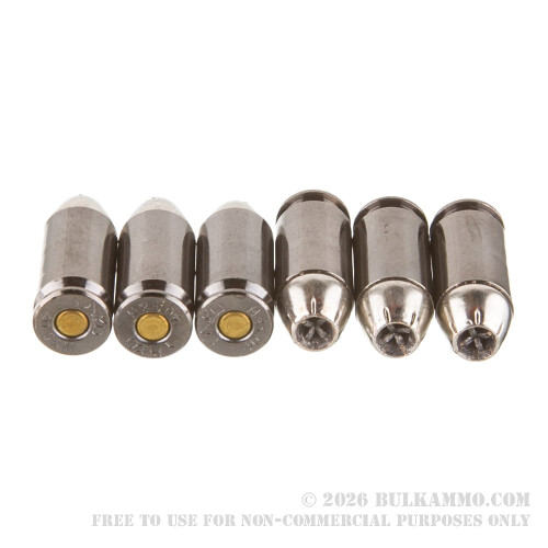 Black nickel plated brass cartridges ensure a smooth extraction and ejection, and the bonded copper jacket ensures a high degree of bullet retention even after passage through drywall, glass, and other intermediary obstacles.