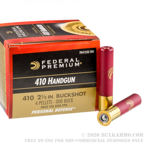 Federal's Personal Defense line of ammunition is designed specifically to give you a favorable edge in a dangerous situation. These 000 .410 shells have the largest sized pellets possible for .410 shot, and are designed especially for results with the Judge revolver. The larger 000 pellets provide more terminal energy per pellet than their smaller counterparts, and they produce tighter patterns, which help to prevent overshoot or misses in dangerous situations.