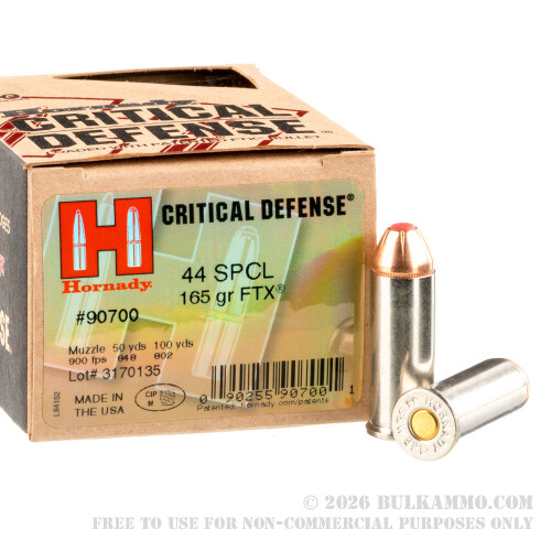 This 44 S&W Special cartridge from Hornady’s Critical Defense line of ammunition sports a 165 grain Flex Tip jacketed hollow point projectile. This bullet’s soft polymer tip serves to keep its hollow point from becoming jammed with fabric upon impact, when it is quickly wedged within the bullet’s cavity to initiate reliable and consistent expansion. The bullet’s InterLock ring ensures that its one-piece high antimony lead core remains locked to its heavy jacket for optimal weight retention during penetration. This bullet further offers a ballistically efficient secant ogive profile which delivers a flat trajectory for stellar accuracy. Along with its 900 fps muzzle velocity, this round’s technologically advanced bullet can be relied upon to deliver great terminal performance in self-defense situations.