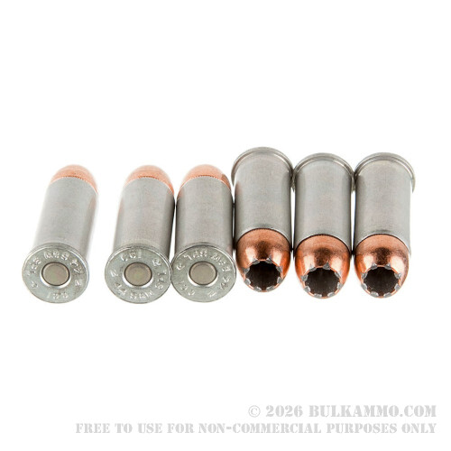 This 44 Special cartridge by Blazer features a 200 grain jacketed hollow point bullet. Unlike a traditional hollow point, the jacket this round’s bullet includes permits much easier feeding in semi-automatic pistols, in addition to the prevention of lead fouling. The jacket aids in penetration as well, which along with the normal expanding action of the hollow point will provide devastating stopping power with a lesser risk of over-penetration that could put bystanders’ safety in jeopardy. The only real downside is that this bullet may not expand quite as well when it encounters thick clothing, but any human-sized target wearing a ski parka is certain to feel it nonetheless.