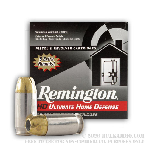 This 45 ACP cartridge from Remington’s HD Ultimate Home Defense line of ammunition is loaded with a 230 grain brass-jacketed hollow point projectile, the original bullet weight for its caliber. Based heavily on the Golden Saber line of ammunition, this hollow point bullet's brass jacket ensures better weight retention and deep penetrate targets. The jacket’s nose is cut completely through to promote controlled expansion to well over 1.5 times its original diameter, and the spiral pattern nose cuts in the bullet’s tip produce large, damaging petals as the bullet mushrooms outward. The result is indeed a cartridge that you can entrust your home’s safety to.