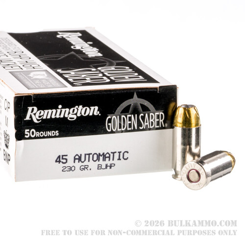 Remington's Golden Saber ammunition is a premium line that takes advantage of modern components in order to yield excellent terminal performance. Each of these .45 caliber rounds utilizes a 230-grain bullet which matches the majority of the caliber's practice and duty loads; this ensures consistent recoil and point-of-aim that a shooter can get familiar with. The projectile itself is of a brass jacketed hollow point (BJHP) design which bears tough outer skin to help it penetrate past heavy clothing without serious deformation. Remington designed the bullet style with a large-diameter mouth adorned by spiral jacket cuts which produce massive expansion during entry, even at a relatively low impact velocity.