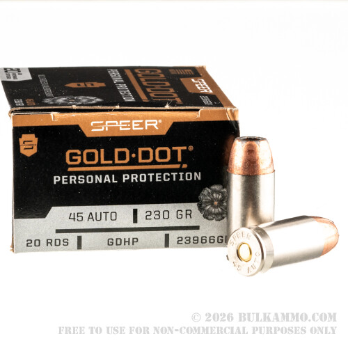 The Speer LE Gold Dot Hollow Point rounds are loaded up with the popular, heavy hitting copper jacketed, solid lead core 230 grain .45 ACP GDHP, or Gold Dot Hollow Point bullets. The GDHP's have a subsonic muzzle velocity of 890-feet per second, and 405-foot pounds of hard hitting .45-inch diameter muzzle energy. These quality Speer LE Gold Dot rounds are loaded into a thick, heavy-walled, new, reloadable, non-corrosive Boxer primed, yellow brass case. These .45 ACP loadings come in the smaller, easy to transport 20 round boxes. Whenever you want to take your family and firearms out on the range for a bit of plinking fun, these rounds are ready to join you. Get yourself a couple boxes of this top end defensive ammo today!