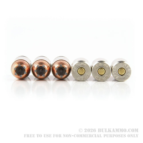 This cartridge is produced by Speer Gold Dot, and as such its 185 grain hollow point bullet possesses a jacket electrochemically bonded to its alloyed lead core. This facilitates with penetration, and also promotes weight retention while the hollow point mushrooms within a target. This round’s brass casing is nickel plated to ensure smooth feeding and ejection, and along with its reliable CCI primer and clean burning propellant makes for a optimal cartridge for personal protection.