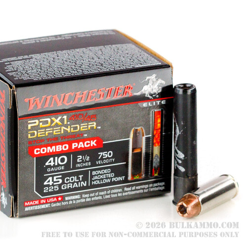 This unique box of 20 rounds is a combo pack of Winchester Defender ammunition for hybrid .410/.45LC revolver like the Smith & Wesson Governor or Taurus Judge. It contains 10 rounds each of .45 Long Colt and 2-1/2” .410 bore shotshells, giving you the versatility and firepower you need to be prepared for any defensive situation.