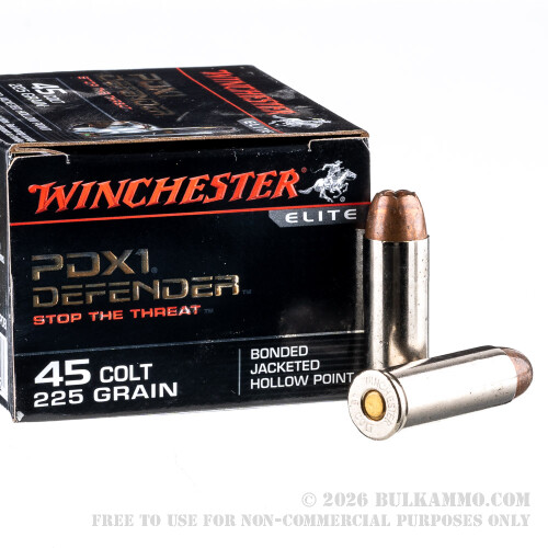 This fantastic 225 grain .45 Long Colt load by Winchester in the PDX Defender Line offers high grain weight, heavy weight retention through the bonded jacketed hollow point and a proven design for consistent expansion.