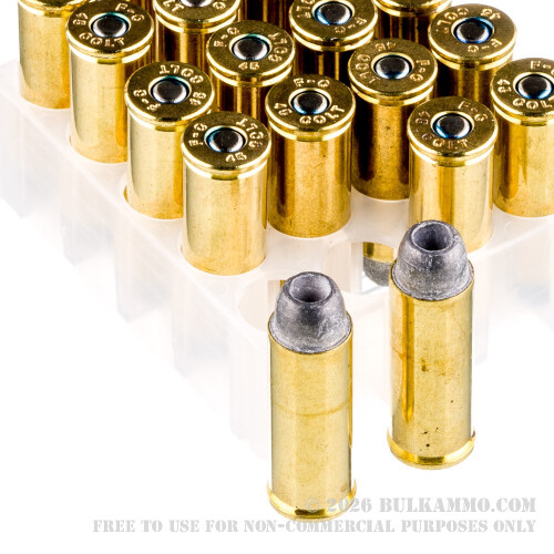 These Federal manufactured .45 Colt Lead Semi-Wadcutter Hollow Point (LSWCHP) cartridges weigh in at 225 grains, and travel at 830 feet per second out of the muzzle. They produce 344 foot-pounds of energy at the barrel, and their boxer-primed brass can be reused. These rounds come packaged in a plastic tray of 20 cartridges, with a Federal branded cardstock box wrapped around it.