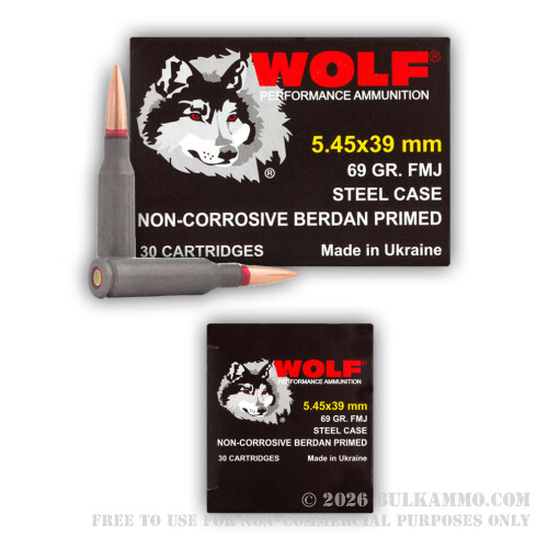 Stock up on some reliable Russian AK-74 food for the frugal shooter! Russian-based Wolf, now headquartered in Placentia, California, is one of the world’s largest producers of steel cased ammunition. These Wolf WPA 5.45x39mm rounds are made in the Ukraine and are a perfect round for a day of plinking or target shooting at the range. These Berdan primed, noncorrosive steel cased rounds are non-reloadable and come equipped with a 69-grain full metal jacket bimetal projectile. Each round also has a sealant around the case mouth and the primer, to prevent corrosion and make for better long-term storage.