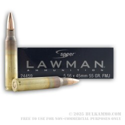 Speer Lawman ammunition is made to high quality standards to meet the training needs of law enforcement, but also serves as an excellent practice load for any gun owner. These 5.56 NATO cartridges for AR-15s and other rifles fire a 55 grain full metal jacket bullet and deliver external ballistics similar to that of M193 ball ammo.