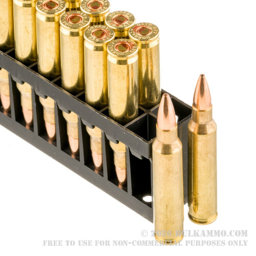 This 5.56x45 ammo is part of Hornady's Superformance line that uses Hornady's Superformance Propellants. These propellants are designed to improve muzzle velocity by 100 to 200 feet per second faster than conventional ammunition, and this round features muzzle velocity of 3130 feet per second. Each reloadable boxer-primed brass case is loaded with a 55 grain GMX bullet that is perfect for hunting medium sized game.