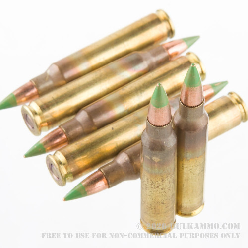 The standard for ammunition for the AR/M4 platform, this cartridge offers a significant improvement over standard ball ammo from generations past. It is a 62 grain stabilized projectile that moves out of the muzzle at 3100 FPS. This load features a stabilizing steel penetrator component jacketed inside of the projectile. Combined with a copper jacket it maintains the barrel life without losing long distance terminal performance.