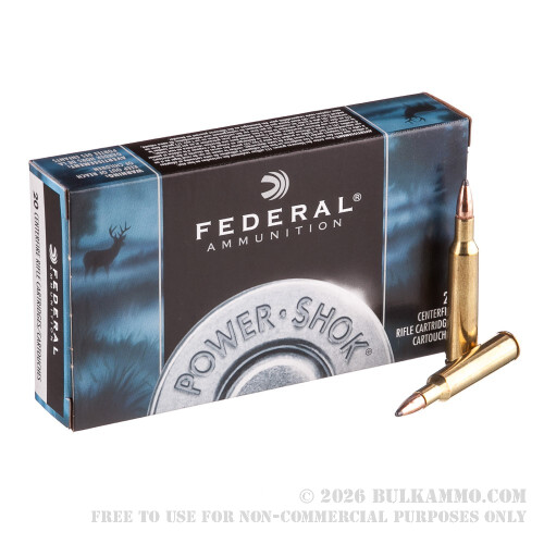 This 6mm Rem cartridge from Federal’s Power•Shok line of ammunition sports a 100 grain jacketed soft point projectile. This bullet bridges the gap between a hollow point and a full metal jacket: It provides expansion comparable to the former upon impact, but also provides penetration like the latter. That makes this cartridge an excellent hunting solution, especially if you plan to take game where firing hollow points is forbidden.