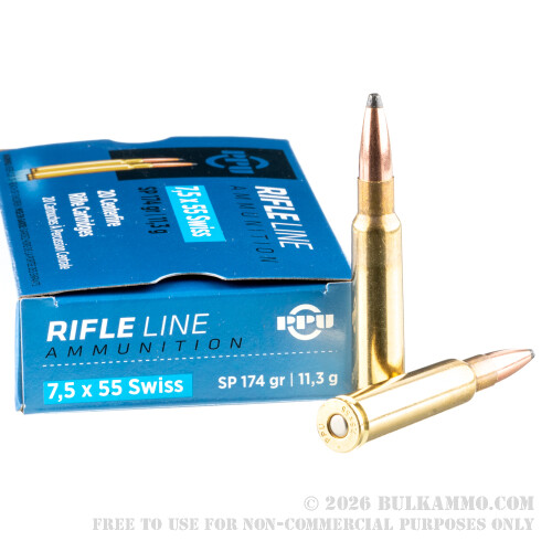 A good price for a round that is becoming more difficult to find in a premium version anymore. The 7.5x55mm Swiss by Prvi Partizan is a top quality new manufacture of the proven military round which had been firmly planted in the mil-surp ammo realm for many years. This is a great hunting choice for those that want to use their military rifle or have a sporterized version that can be used for deer season.