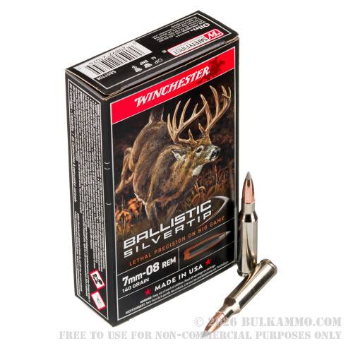 This 7mm-08 Rem cartridge by Winchester sports a 140 grain Ballistic Silvertip projectile. The bullet features a polymer tip designed to facilitate feeding in tubular magazines. The tip further enhances the bullet’s performance by resisting deformation, maximizing long-range accuracy, and initiating expansion upon impact with the target. This bullet’s alloyed lead core provides substantially increased weight so it can penetrate targets deeply, and its contoured jacket promotes rapid yet controlled expansion for tremendous stopping power.