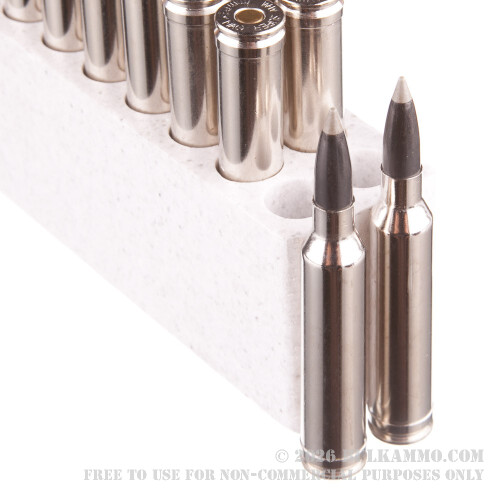This cartridge features a 140 grain Ballistic Silvertip projectile by Nosler. With its deformation preventing polymer tip, barrel life prolonging Lubalox exterior coating, expansion controlling fully tapered jacket, expansion promoting ballistically engineered heavy solid base, and special lead-alloy core that combats deformation, this projectile offers an impressive collection of performance enhancing features.