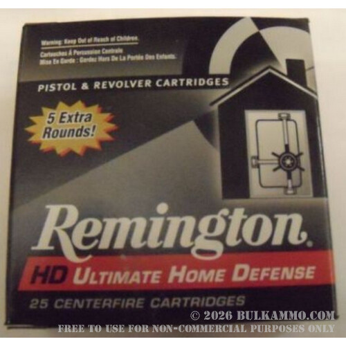 Most 9x19 Luger ammo features a copper jacketed lead core hollow point bullet, but not the most recent Remington HD Ultimate Home Defense cartridges. These rounds feature a Brass Jacketed 124 grain 9mm bullet with a deep cavity Hollow Point design that is cast right into its solid lead core. This hollow point design is such that when it strikes the intended target, it fully expands and travels deep into the tissue to provide maximum stopping power in a small package.