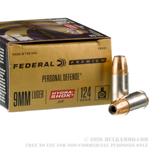 Federal Premium 9mm Luger Hydra-Shok 124gr Jacketed Hollow Point rounds are boxer-primed with nickel plated brass. This 124-grain projectile is a mid-grade weight falling in between the 115 and 147 grain. The various grain count selection is personal preference and depends on what you’re looking for your ammo to do. Typically, heavier grain counts can have a more powerful impact, but possibly have a higher recoil. Lower weight rounds may not impact quite as hard but have a smaller recoil. This round falls right in the middle, which is a good starting point if you’re unsure where you should be. Muzzle velocity is 1120 feet per second. Packaged with 20 rounds per box, 25 boxes per case.