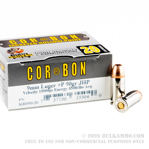 20 Rounds of 9mm +P Ammo by Corbon - 90gr JHP