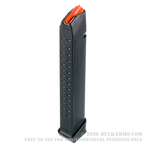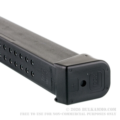 This Glock mag will not leave you guessing how many shots you have remaining; just consult the numbered witness holes for instant reference. Its stainless steel spring resists corrosion and stays supple for a very long time, even when it is compressed by 33 rounds. If you have trouble loading that many cartridges when the mag is fresh out of the box, that only means it requires breaking in.
